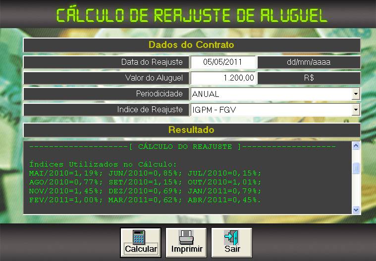 - Permite o cálculo pelos índices do IGPM-FGV, INPC-IBGE, IPCA-IBGE, CUB-SINDUSCON, IPC-FGV, IPC-FIPE, POUPANÇA, SELIC-BACEN, TBF, TR-BACEN, ICV-DIEESE, INCC-FGV, IGP-DI-FGV, TJLP-BACEN e IPA-DI-FGV.