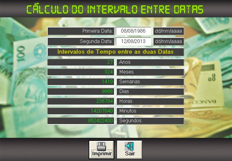 - Calcula a diferença entre duas datas conforme os seguintes intervalos: Anos, Meses, Semanas, Dias, Horas, Minutos e Segundos