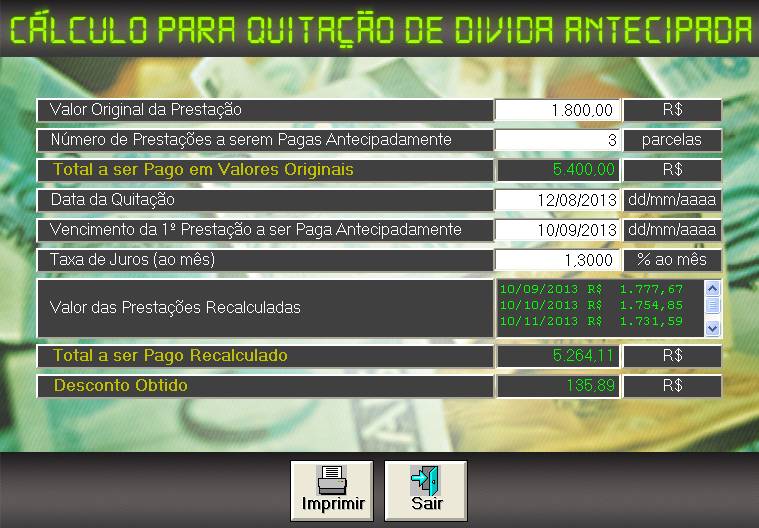 - Calcula o valor correto para a quitação antecipada de uma dívida