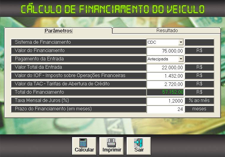 - Permite o cálculo pelo sistema CDC ou Leasing