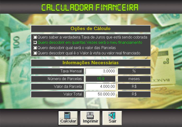 - Prazo: Permite descobrir a quantidade de parcelas que será necessária para um financiamento